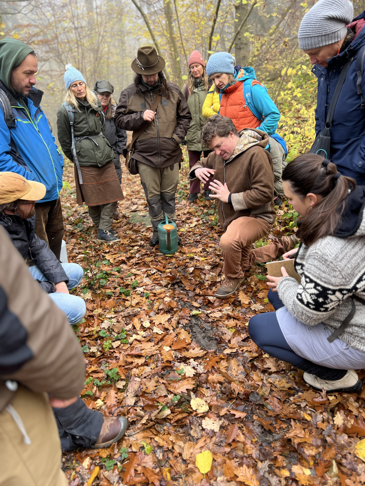 Chodíme s průvodci a dětmi pravidelně na stejné místo “K bukvicím” a pozorujeme, jak se v mění v čase. Naše všímavost se prohloubila natolik, že jsme si tam, kde jsme původně jen sbírali traviny na věnce a využívali zdroje krajiny, všimli tří různých druhů bobků. Když jsme se otočili, uviděli jsme ve vysoké trávě zvířecí pěšinu vedoucí do blízké smrčiny – a na ní podobné bobky. Šli jsme po pěšině a náhle z dálky vyběhli. Běželi ve vzdálenosti výborné pro pozorování. Do ticha užaslých dětí se ozvalo: „Wow, oni vážně existují." Stopy, bobky a pěšinu jsme si spojili do jednoho obrázku zvířete, které s námi v podkomorských lesích žije.
